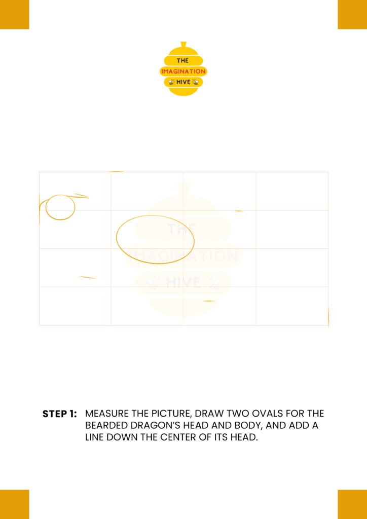 Measure the picture area, draw two ovals for the bearded dragon’s head and body, and add a line down the center of its head to guide facial placement.