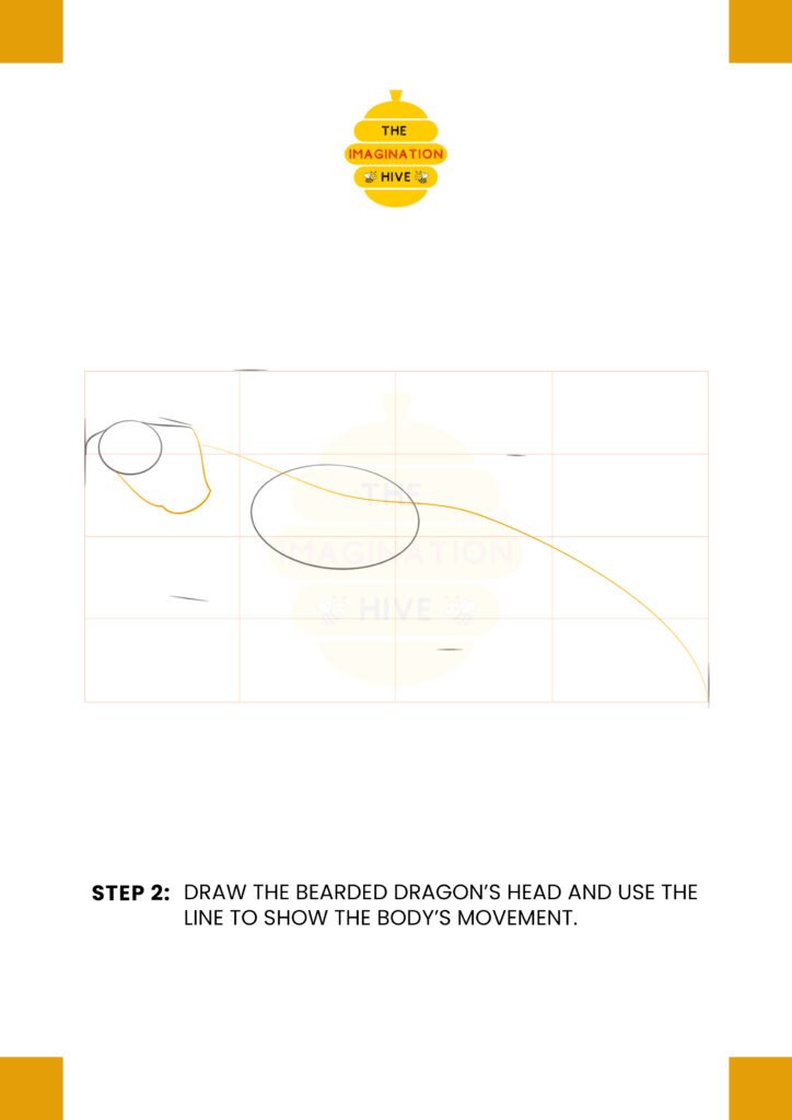 Draw the bearded dragon’s head shape and use a long, smooth line to show the direction and movement of its body and tail.