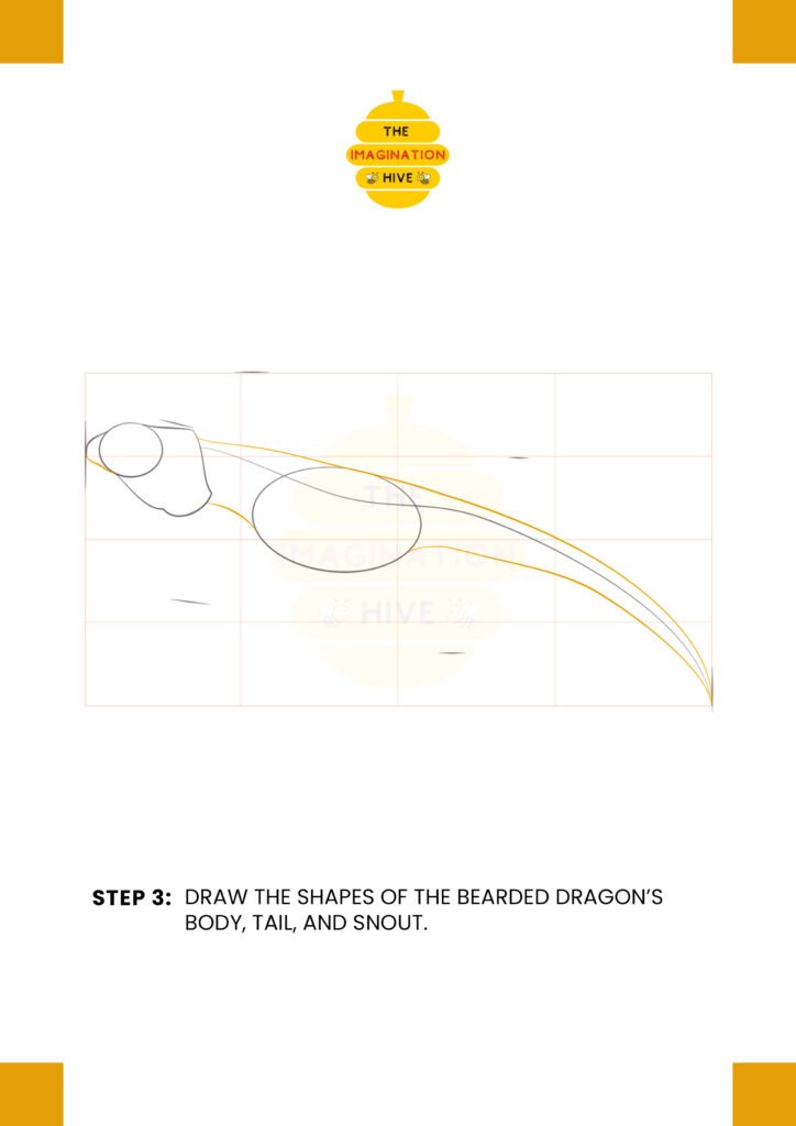 Sketch the shapes of the bearded dragon’s body, tail, and snout, connecting them smoothly using the guide lines.