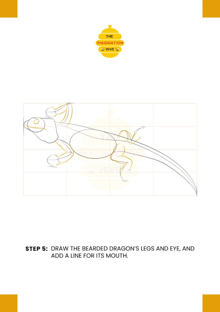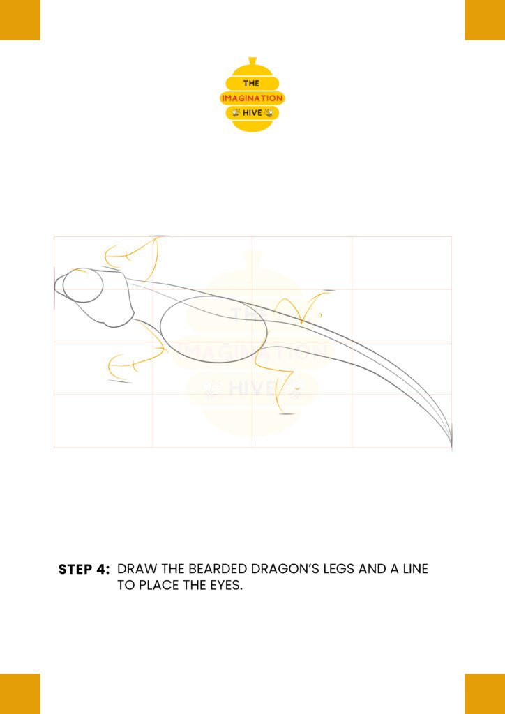 Add the bearded dragon’s legs and draw a simple line to mark where the eyes will sit on the head.