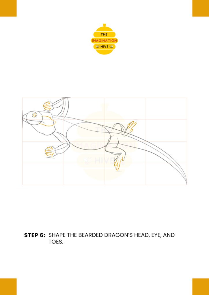Define the head shape, refine the eye, and draw the toes on each foot to make the bearded dragon more recognizable.