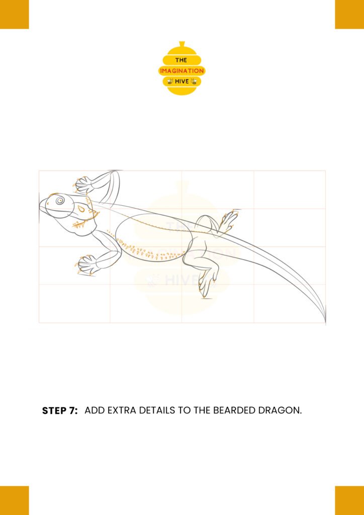 Add spikes, scales, and texture along the head, belly, and tail to bring the bearded dragon to life.