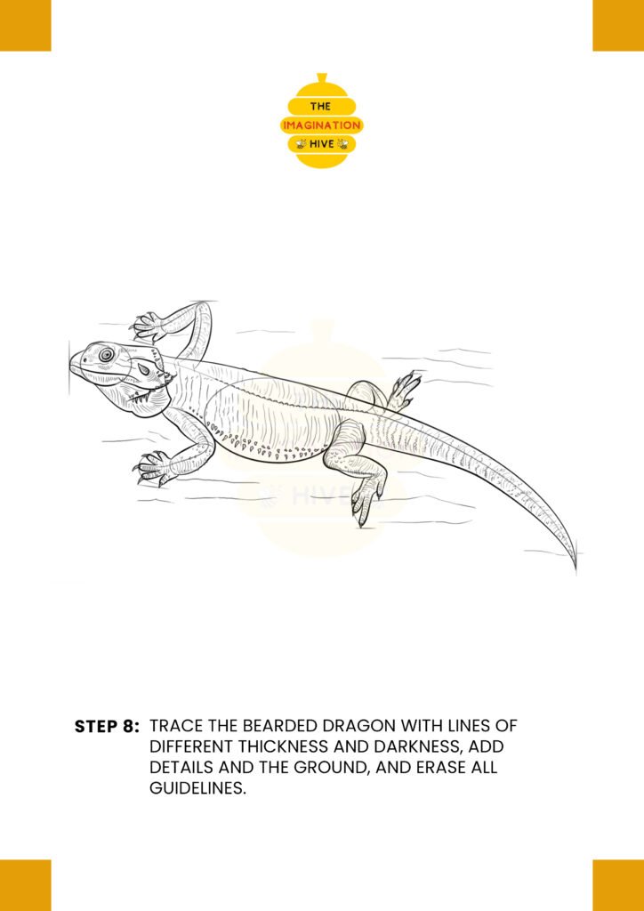 Trace the bearded dragon with lines of different thickness and darkness, add the ground, and erase all remaining guidelines to finish the drawing.