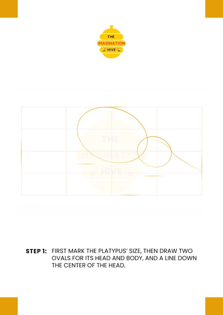 First, mark the platypus’s size on your page. Draw two simple ovals to represent the head and body, then add a straight guideline down the center of the head to help with symmetry.