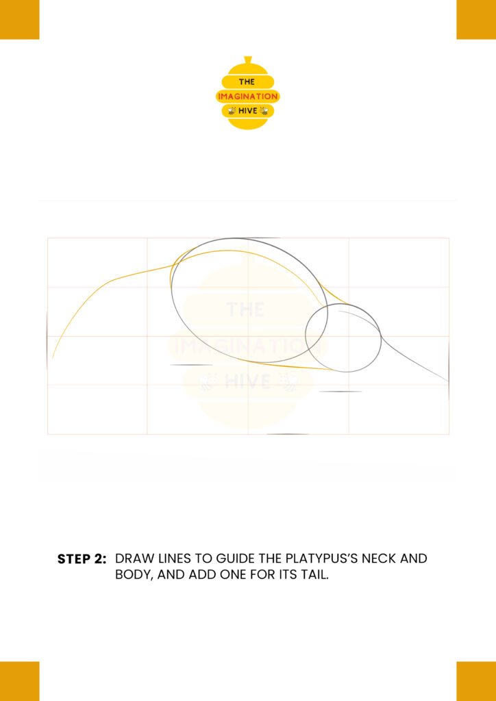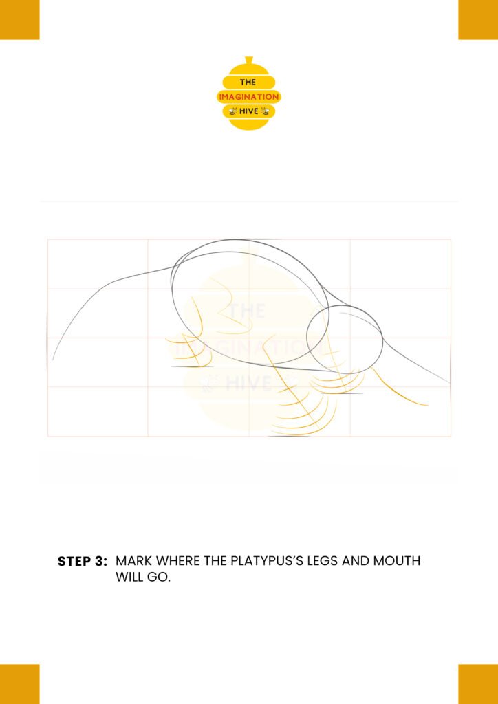Mark where the platypus’s legs and mouth will go by sketching simple curved guidelines beneath the body and near the front of the head.