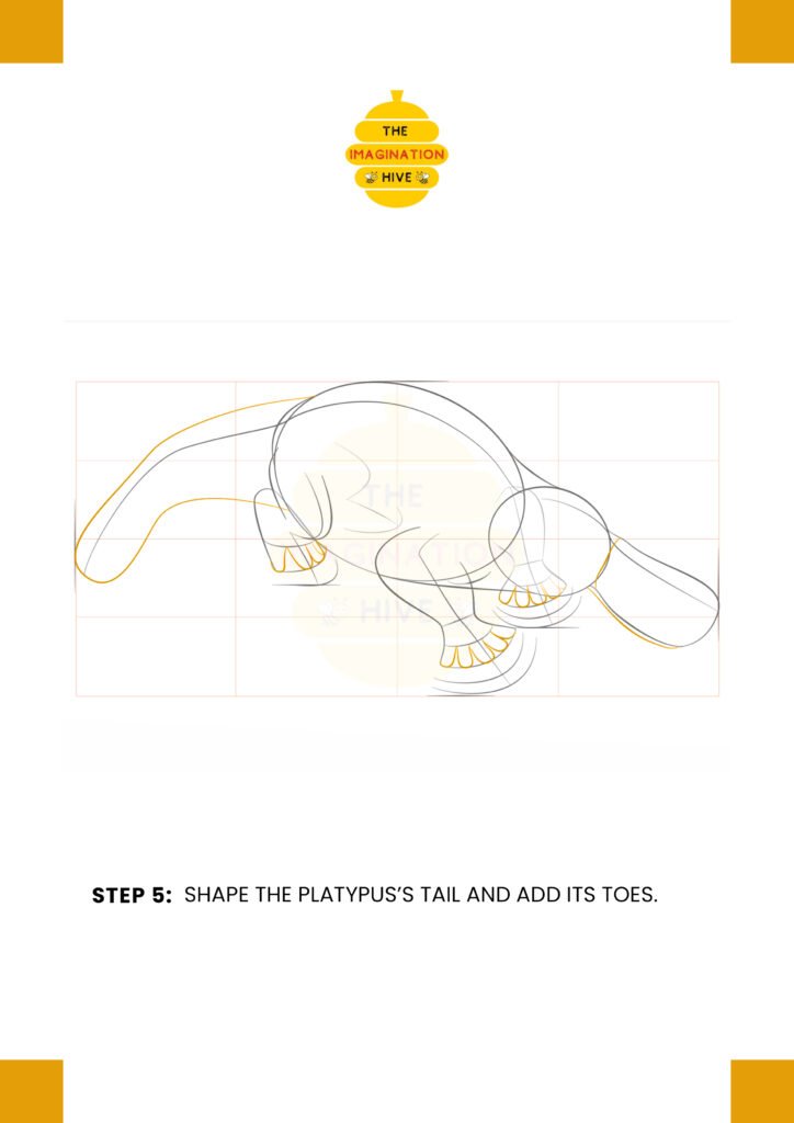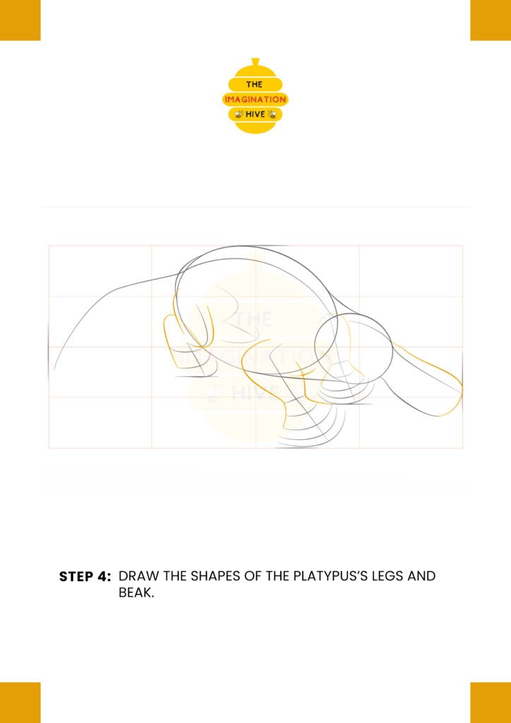 Draw the basic shapes of the platypus’s legs and beak, turning the guidelines into clearer forms while keeping the shapes simple.