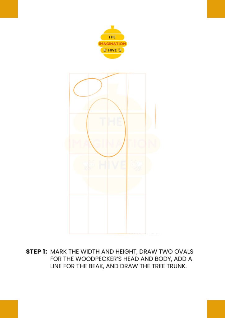 Mark the overall width and height of the drawing area. Draw two ovals for the woodpecker’s head and body, add a straight line for the beak, and sketch the tree trunk beside it.