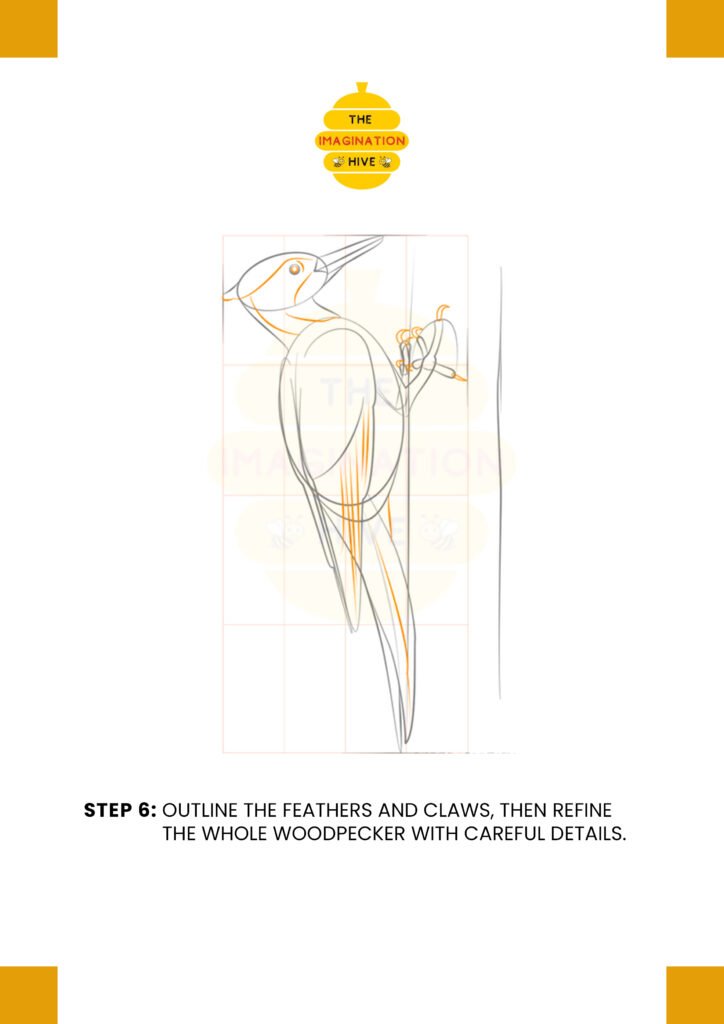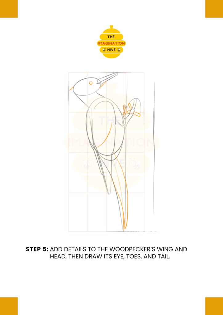 Refine the wing and head shapes, then draw the eye, toes, and tail to give the woodpecker more character.