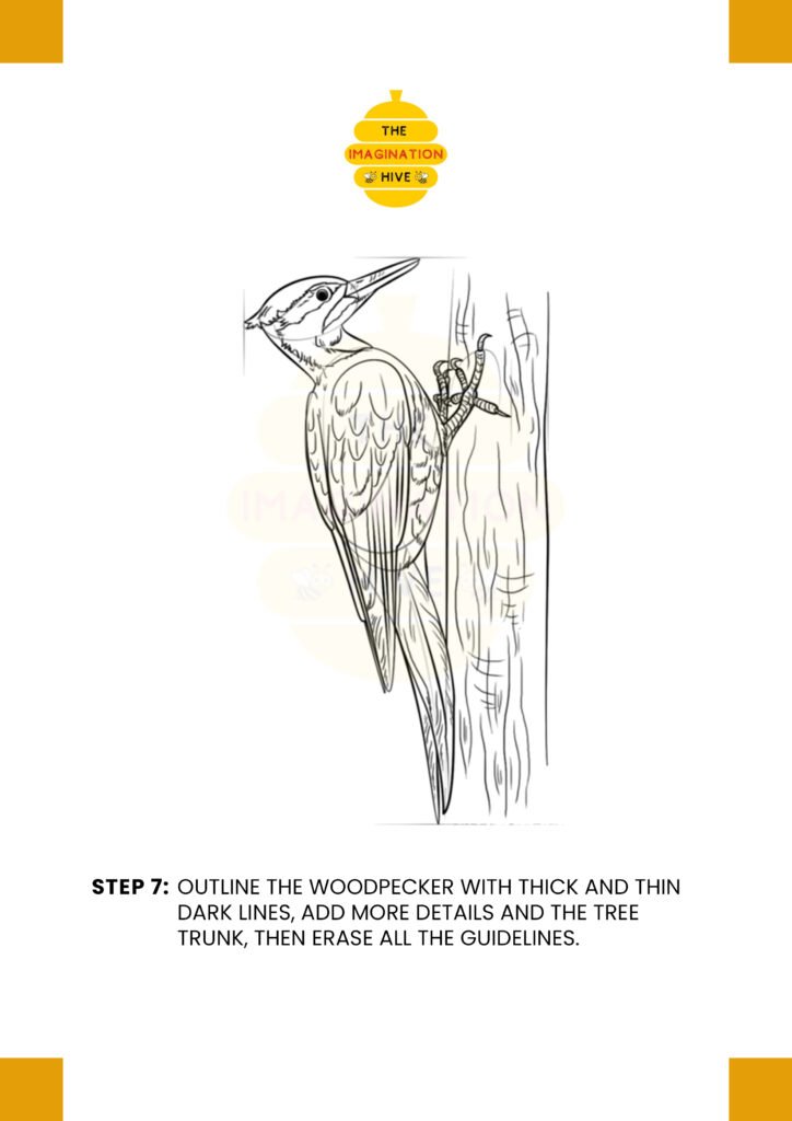Outline the woodpecker with thick and thin dark lines, add details to the tree trunk, and erase all remaining guidelines.