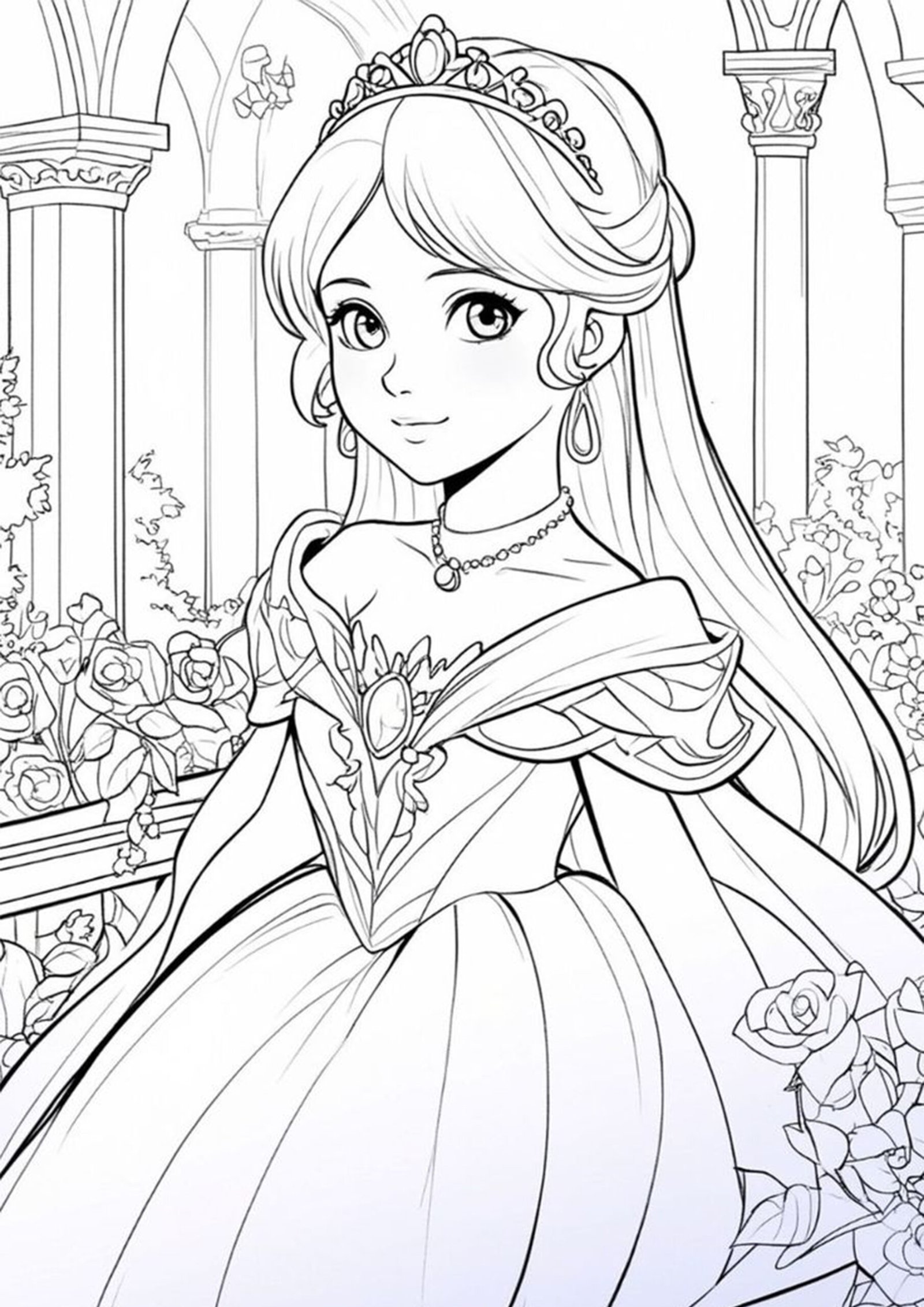 Kids can enter a magical world from a fairy tale with this princess coloring page. Kids can use their favorite colors to color the princess’s surroundings, crown, and outfit. It promotes imagination, creativity, and dexterity. Ideal for aspiring artists who enjoy royal tales.